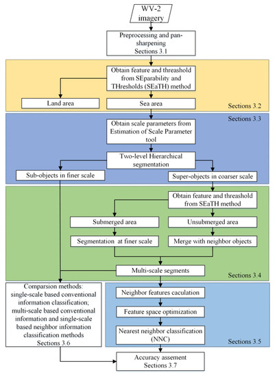 Figure 3 shows the overall methodological framework of this research. Following preprocessing and pan-sharpening, the land surface, which is not be classified in this study, was firstly masked by using a rule-based approach. We obtained the optimal features and threshold by applying an automatic feature selection methodology. Subsequently, we operated a coarser scale segmentation in the sea area. Based on the coarser scale segments, we separated the submerged and unsubmerged areas. We performed the separation process because we wanted to create semantically meaningful objects for CCA and RCA in the separated unsubmerged area and submerged area, respectively. After that, we defined and calculated several object-based neighbor features based on the multi-scale segments. We then conducted the final classification process to identify the RCA and CCA by combining these neighbor features. To verify whether our proposed multi-scale based neighbor information classification (MNIC) method can effectively improve the classification accuracy, we adopted a single-scale based conventional information classification (SCIC) scheme for comparison. Besides, we also studied the effects of multi-scale segmentation and neighbor features by using the multi-scale based conventional information classification (MCIC) method and the single-scale based neighbor information classification (SNIC) method, respectively.