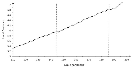 After the separation of land and sea areas, we operated a two-level hierarchical segmentation scheme in the sea area to generate coarser and finer scale image objects, which were expected to represent semantically meaningful image objects of CCA and RCA, respectively. Instead of the commonly used trial-and-error process, we adopted an objective method, which is called Estimation of Scale Parameter (ESP) tool [30], to select the candidate SPs. The ESP tool iteratively performs segmentation in fixed step sizes and calculates the local variance (LV) for each scale. Figure 4 shows the LV values that were plotted against the corresponding SPs. Based on this figure, the peaks in the LV curve indicate appropriate SPs. At these peaks, they are expected to represent semantically meaningful objects characterized by relatively equal degrees of homogeneity. The graph shows that the scale of 144 represents an obvious sharp break after a continuous and abrupt increase. Thus, we set 144 as the finer segmentation scale. After a visual evaluation of the candidate SPs near 180, we selected 186 as the coarser segmentation scale.
