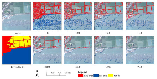 Figure 5 shows the segmentation results with different SP settings. After a visual inspection on the output image objects, ponds that were expected to be included in the land area are delineated at scales of 100–3000, which can then easily be misclassified as sea area. Consequently, there is obvious under-segmentation at scales of 100–3000 for land and sea areas separation. Although the land and sea areas are delineated accurately, both the scales of 7000 and 9000 have a very limited amount of segments for training (scales of 7000 and 9000 generated a total number of 25 and 21 segments, respectively). Besides, small islands in the sea area may also be included in a segment of sea area with the increase of SP. Therefore, we set the scale of 5000 as the optimal SP, generating 47 segments.