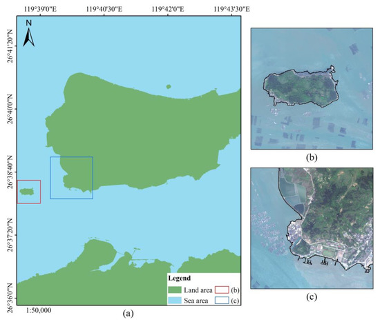 We selected a coastal area of approximately 110 km2 around Sandu Island as the study area, which is located in Ningde City, Fujian Province, China (119°40′54″E, 26°39′21″N, Figure 1). This location is characterized by its ideal environment for coastal aquaculture, as it has unique hydrological and geographical conditions; namely, the semi-closed natural harbor and several small islands located in the harbor mouth, weakening typhoons, and accumulating nutrients in seawater, which provide an ideal environment for aquaculture. Therefore, a large number of aquaculture areas, which mainly include raft culture areas (RCA) and cage culture areas (CCA), were developed in this region (Figure 2).