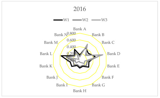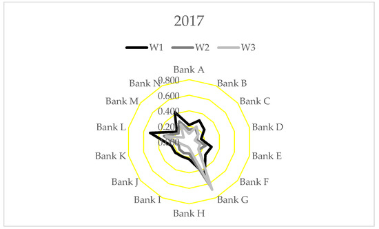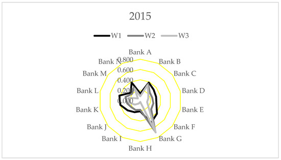 Concerning evolution over time, we detected some backsliding in banks’ sustainability performance during the period under consideration. Only four banks improved their scores by the end of 2017 compared to 2015 according to the calculations that used w1 weight. Three improved according to w2 weight, and five improved according to w3 weight. Although during 2015–2017 banks incurred additional expenses due to the implementation of new capital requirements regulations, additional banking taxes and the restructuring of currency mortgages, they still achieved relatively good financial results in this period.