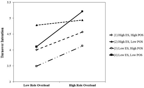 To further test Hypothesis 3, we plotted a graph and conducted a slope difference test [41]. As shown in Table 6 and Figure 2, the slope of Group 4 (low equity sensitivity and low POS) is significantly different from those of other groups. As hypothesized, the relations between role overload and turnover intention are strongest under low equity sensitivity and low POS. These results also support Hypothesis 3.