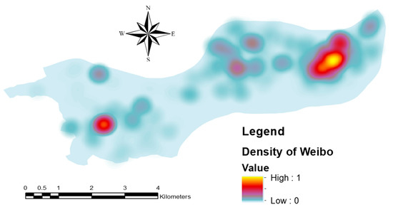 Geo-located social media records are appropriate and commonly used to detect population activity, because check-in location data are usually recorded when users stay in a location for a period as they engage in social media activities. For example, geo-located social media like Weibo microblogs, a social platform similar to Twitter, allow users to post messages each containing fewer than 140 words [40]. Location-based spatio-temporal social media data from Sina Weibo were obtained by large-scale crawler technology. Weibo data can be obtained using Application programming interface (API) from the website (http://open.weibo.com/wiki/位置服务). In addition, the Sina Weibo users are mainly young and middle-aged people. Altogether, a dataset of more than 444,000 check-in observations in 2016 were collected through API for this research. The collected Weibo check-in data contain longitude and latitude. After preprocessing, ESRI ArcGIS 10.5 was used to transform the check-in data are from .csv format to point .shp format. Then, the fishnet function of ArcGIS10.5 was used to divide the Yuzhong District of Chongqing into the grid before the number of check-in data in each grid could be calculated. In this research, the density of Weibo check-in datasets in 2016 was then calculated in Yuzhong District (Figure 2) for further experiments.