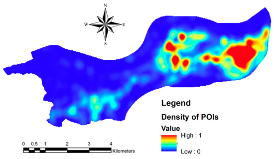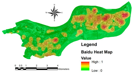 Baidu Heat Map was launched by Baidu based on the real-time location data derived from smartphones with Baidu Maps and other apps [41]. Baidu Map has over 200 million users and processes 3 million position requests per day, which makes it reliable and effective to help detect urban population mobility (Figure 4). After geocoding, the Baidu Heat Map used in this study was converted into raster format. The heat values between 0 and 1 were assigned to different places. The closer the value is to 1, the high the population concentration and vice versa.