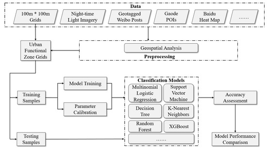 In this study, the XGBoost method was employed and compared with other commonly used methods to classify urban functional zones. The framework of our methodology can be seen in Figure 5 that comprises data pre-processing, feature selection, model construction model evaluation, and model comparison. Each module is explained in the following sections in detail.