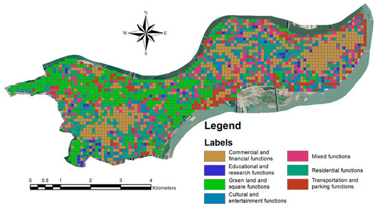 After data pre-processing, it can be detected that there are 2381 urban functional zones grids in Yuzhong District, Chongqing. There are seven kinds of functional zones, and the commercial functional zone is the majority (Figure 7). To make the results of our research reliable and stable, the testing of these classification models has been repeated for 100 times on the input datasets, and the average of classification accuracy was obtained as the final accuracy of the model for further comparison [31].