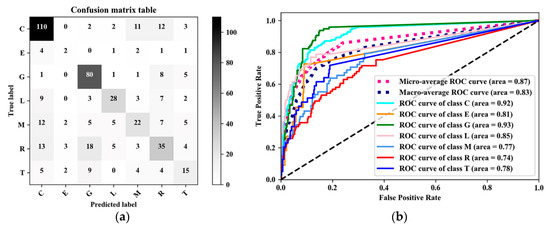 The Multinomial Logistic Regression model: (a) the confusion matrix; (b) the receiver operating characteristics (ROC) curve (area represents area under the curve (AUC) value).