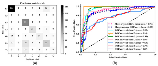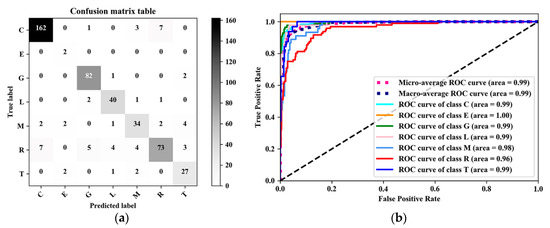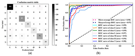 A confusion matrix is a table or a figure that is often used to show the TP, TN, FP, and FN of a classification model (see Table 1 for details). Confusion matrix, as an evaluation indicator, also shows the different performances of the classification models. Typically, it is a tabular representation showing the strengths and weaknesses of our model. In the confusion matrix, element aij denotes the number of test class i that the classification model predicted as the class j. The diagonal elements aii means that this is the correct predictions. ROC curve is a graph that summarizes the performance of a classification model based on different threshold settings and is generated by plotting the TP Rate against the FP Rate, and AUC represents degree or measure of separability [50].