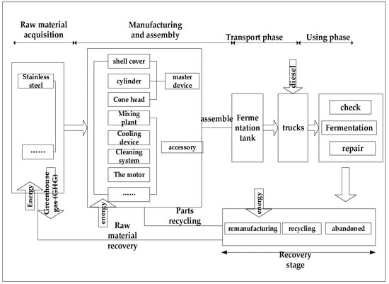 Carbon footprint of products refers to carbon equivalent emissions from raw material acquisition to the end of life throughout the life cycle [14]. The system boundary of beer fermentation cylinder is shown in Figure 1. Other smaller parts have little influence on the calculation results of carbon footprint, which can be neglected [15]. The 25-year service life can be selected as the functional unit for calculating the carbon footprint of beer fermentation cylinder. Since the energy consumption of beer fermentation stage cannot be distinguished from that of other stages, the energy consumption of fermentation cylinder accessories is taken as the basis for calculating carbon footprint.