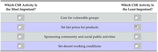 The questionnaire includes three sections. The first part of the questionnaire was designed with BWS and the second was designed with the Likert scale method. The first part measured the consumer priorities for CSR activities. It was generated by Sawtooth Software SSI Web 6.4.6 (Sawtooth Software, Provo, UT, USA), and the main input parameters were thirteen objects (CSR activities in Table 1). Four objects formed a task (task example shown in Figure 1), thirteen tasks were a set, and the number of questionnaire versions was eight. The respondents were asked to select the most important CSR activity and the least important CSR activity in each task. The second part measured the consumers’ comparative perceptions of CSR activities, and used the relative comparative method to measure the consumer’s perception difference between Huawei and Apple in each CSR activity. The question was “How do you think Huawei’s performance in this CSR activity compared to Apple’s?”. Respondents marked their responses from −3 (much worse) to 3 (much better), with 0 indicating no difference in perception. The third part investigated respondent’s demographic information, including gender, age, education and monthly income.
