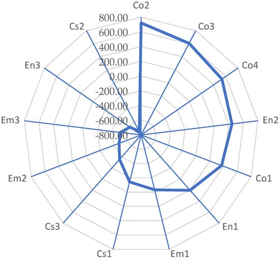 Ranked eighth is the activity “Sponsoring local community and social public activities” of the community and society domain, with a score of −143. Ranked ninth is the activity “Care for vulnerable groups”, also belonging to the community and society responsibility, with a score of −357, which is a large difference compared to the eighth-ranked activity, indicating that this activity is not very important to most consumers. The two activities belong to charitable responsibility, and it is surprising that their rankings are so low on the list.