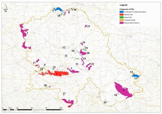 Bearing in mind that the manner of management and the scope of obligations of the manager greatly differ depending on the size and type of the natural resource [], a division has been made to allow results to be more easily processed and displayed. Protected areas established for the purpose of conserving the ecological and geological values are named protected areas sensu stricto (i.e., in a narrow or strict sense) []. These are natural entities whose surface exceeds 100 ha. Protected parks, conserved for the reason of created horticultural values, mainly located within urban areas and generally smaller than 100 ha, have been singled out. The singular protected areas, namely protected trees, have also been singled out.