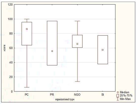 “Box and whiskers” plot of score distribution depending on the manager’s organizational type.