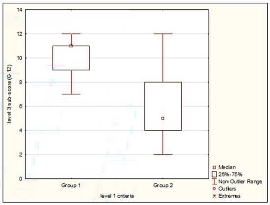 “Box and whiskers” plot of Level 3 sub-score distribution depending on the fulfillment of the Level 1 criteria.