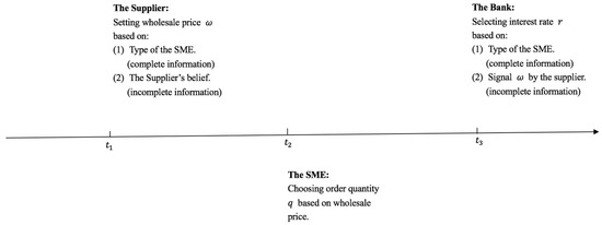There are some mechanisms and techniques developed and adopted by banks to deal with the problem of information asymmetry between banks and SMEs, such as factoring [24] and relationship lending [25]. Many researchers examine the role of the supply chain background of SMEs in accessing bank financing. They argue that the operational status and transaction background of SMEs in a supply chain may reduce information asymmetry, helping SMEs access external financing [26,27]. These studies, mostly empirical works, provide important insights into how the supply chain background may help SMEs access external financing. Nonetheless, there are limited discussions on the strategic interactions between banks and firms in a supply chain. Moreover, studies on supply chain finance (henceforth, SCF) have not yet provided enough explanations on why and how the supply chain background can help relieve information asymmetry and improve SMEs’ access to external financing.