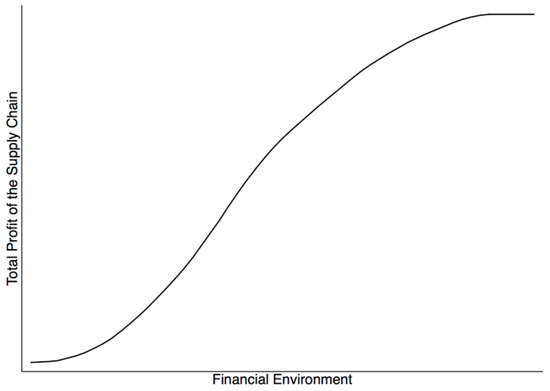From Figure 2, we can find that there is a non-linear positive relationship between the financing environment and the total profit of the supply chain. The positive profit effect always dominates the negative risk effect when there is an improvement in the financing environment, hence, their aggregate effect on the total profit of the supply chain is positive. However, we can also observe that this aggregate positive effect becomes weaker and weaker beyond a certain level of the financing environment. The above analysis indicates that an improvement in the financing environment for SMEs facilitates the development of the supply chain, which is supported by Beck et al. [91].