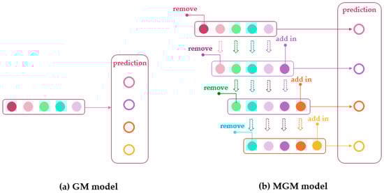 In order to solve this problem, data replacement can be added as a solution for the GM model. This improved model is called the metabolic grey model (abbreviated as the MGM model) [43]. The MGM model usually continues the calculation of the GM model in general. Specifically, the data processing method and the differential equation construction method of the MGM model are the same as the GM model. The difference is that the MGM model divides the prediction process of GM model into a number of prediction rounds, and the data used for each round of prediction is different. To illustrate the differences between the two models, Figure 1 shows the corresponding prediction processes of GM model and MGM model. Each colored circle represents a known block of data, while the open circle represents a block of data that needs to be predicted in the future.