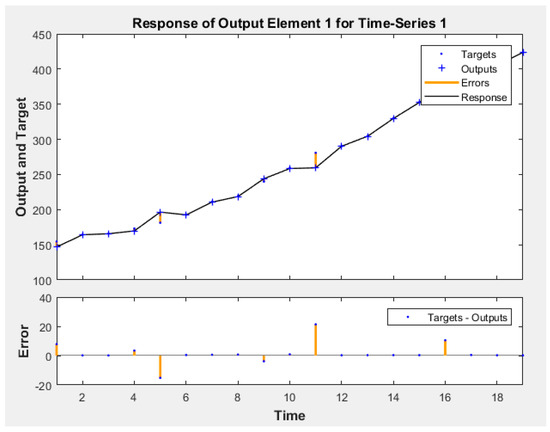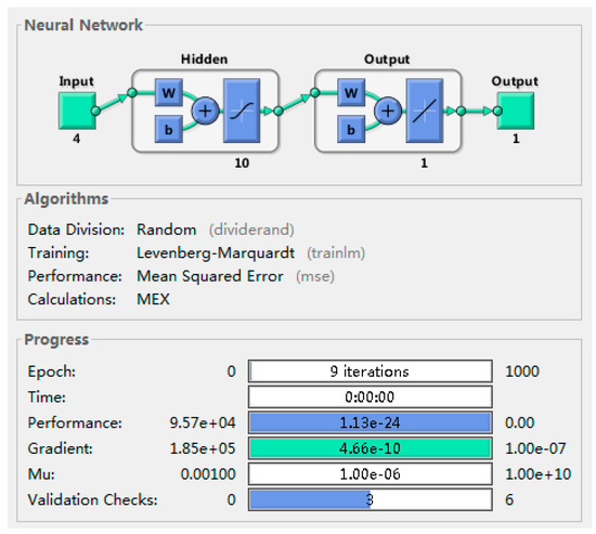 According to the method descripted above, the BP model needs to standardize the data before the operation. After that, a one-layer BP network was built [30]. The one-layer network includes an input layer, a hidden layer, and an output layer. For the number of neurons included in each layer of the network, the input layer contains 4 neurons, and both the hidden layer and the output layer contain 1 neuron. The settings of each aspect are as follows: the network hidden layer neuron transfer function uses ‘tansig’, the output layer neuron transfer function is ‘logsig’. The training function adopts ‘trainlm’, the minimum training error is 1 × e−7 and the number of training is 1000. After repeated training, the results of the final idealized model are shown in Figure 5. The error renderings in Figure 5 reflects the better model run results.