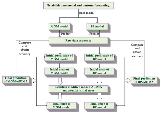 In this study, two combined linear modified linear (MGM-ARIMA) and linear modified nonlinear (BP-ARIMA) models were developed to predict India’s coal consumption. The similarity between the two models is that the modified models are all part of the ARIMA model. However, the difference is that the MGM-ARIMA model uses the MGM model as the base model, and the BP-ARIMA model uses the BP model as the base model. Since the principles of the three single models involved have already been explained before, Figure 3 will briefly introduce the main combination methods.