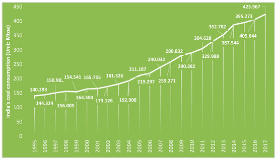 India, with a total population of more than 1.3 billion, has become the world’s third-largest emitter of greenhouse gases while rapidly industrializing and urbanizing. Coal is one of the most important causes of this problem. As the world’s second largest coal consumer and importer, India’s future coal changes will have a huge impact on the global coal trading market [1,2,3]. In addition, in terms of the impact on the domestic energy market, in 2016, India relied on coal to produce three-quarters of its electricity. This means that coal has an important supporting role in India, and that it impacts on the balance of supply and demand in the domestic energy market. Based on this situation, accurately predicting India’s future coal consumption is conducive to the formulation of both environmental and energy policy. On the one hand, controlling coal trends is beneficial to controlling India’s greenhouse gas emissions. On the other, determining changes in India’s relationship with coal plays an important role in controlling the global coal trading market ahead of time and balancing domestic energy supply and demand.