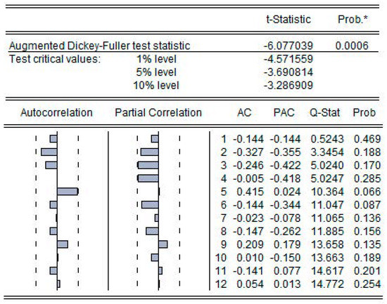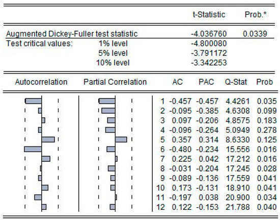 Figure 7 shows the results of first-order difference of this sequence. Two points of information can be drawn in this figure. First, the value of T-statistic is less than 1% test critical value, which is consistent with the inspection range. Second, the value of ‘P’ is 0.0006 < 0.01, which is also within the 1% confidence interval. The above two points prove that the sequence after the first order difference is stable, and that it satisfies the conditions of the next ARIMA model operation. That is, d = 1.
