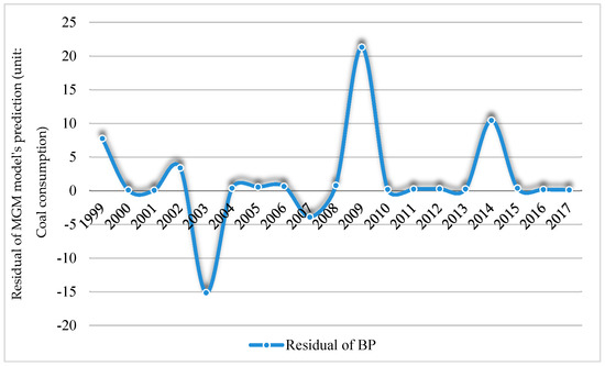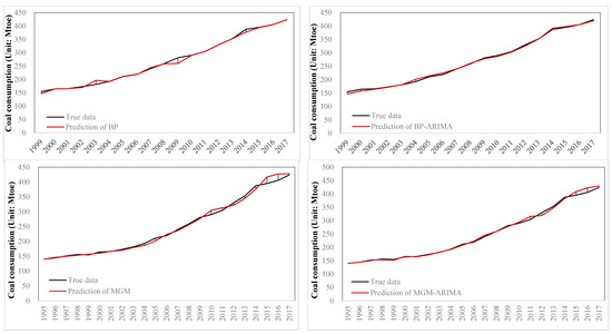 The forecasting work of this study adopts the principle of “multi-model comparative prediction”. The forecasting tools used include two single models (MGM and BP model) and two combined models (MGM-ARIMA and BP-ARIMA). In conjunction with methods described in Section 2, a detailed forecast of coal consumption in India will be developed in this part.