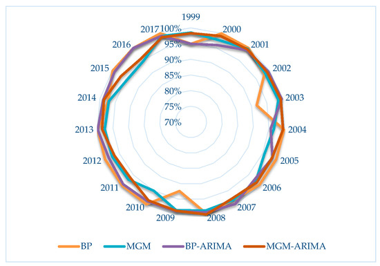 If measured by numerical values, the mean relative error can be used as the main indicator for judging the accuracy of prediction. Assume that the prediction accuracy is equal to 1 minus the relative error. Figure 12 compares the prediction accuracy of the four models per year. From the results shown in the figure, the minimum accuracy is higher than 90%. The accuracy is around 95%. The accuracy of this series shows that the predictions of the four models are all perfect.