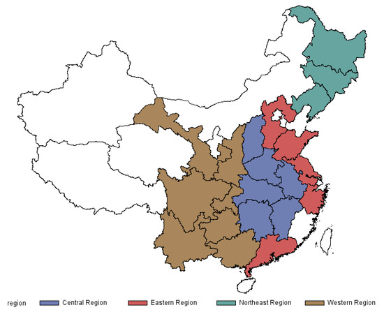 Because agronomic and socioeconomic conditions differ significantly across the nation, we speculate such a difference in both returns of farming and off-farm jobs may result in heterogeneous patterns of farmers’ off-farm labor supply. We consider including a set of variables to present different regions while not losing too many degrees of freedom in the regression. Therefore, we group the locations of our sampled farm households into four regions: (1) Western region; (2) Northeastern region; (3) Central region; and (4) Eastern region. The geographic boundaries of these four economic regions were defined by the central government during the Eleventh Five-Year Plan of China and have been widely used since then. Our study area with regional divisions is presented in