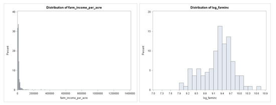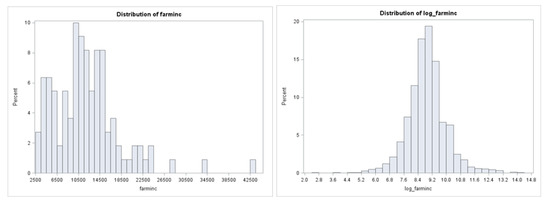 Furthermore, we examined the distribution of farm income using multiple data sources. We found that per acre farm incomes of the CHFS data set in 2010 and of the National Bureau of Statistics of China (NBSC) data set from 2005 to 2009 are indeed log-normally distributed as illustrated in