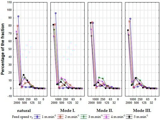 In our opinion, fractions < 125 μm are most significant because they represent risks to the working environment. It has been observed that their maximum percentage representation reached at low feed speeds and their minimum percentage representation reached at high feed speeds.