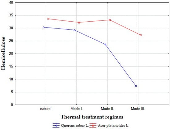 Figure 4). Both wood species show the greatest decrease in hemicelluloses in Mode III. While in maple wood, this difference was 6.4% and represented 19% of the original wood, in oak wood the difference was 22.9%, which represented a decrease of up to 75.6%. For both wood species, a similar course of lignin and polysaccharides ratio were also recorded [