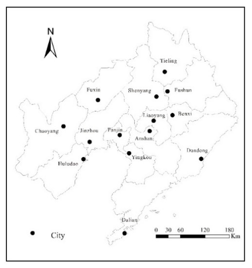 Liaoning Province is a traditional old industrial base in China. It has 14 prefecture-level cities (Figure 1), which are all old industrial cities. Liaoning Province has developed a relatively complete industrial system since the establishment of the People’s Republic of China (PRC) in 1949. Due to its outstanding contributions to the national industrial economy, it was called the cradle and the eldest son of the PRC [32]. In later sections, we will explain the industrial development history of Liaoning Province.