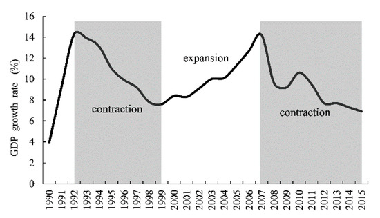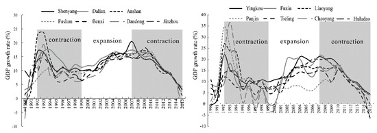 This paper divides the regional economic cycle by the change of GDP growth rate [6,7]. Figure 2 and Figure 3 show the GDP growth rates in China and the 14 prefecture-level cities in Liaoning, respectively, since 1990. From Figure 2 and Figure 3, we can see that the trend of urban economic growth rate in Liaoning was similar to that of the whole country. To make these data comparable between cities, the paper uses the “peak-to-peak” method (measuring from one peak to another peak for one economic cycle) to divide the economic cycle with reference to the change of GDP growth rate at the national level [7,8]. As shown in Figure 2, from 1992 to 1999, the national GDP growth rate declined from 14.3% to 7.6%, which was mainly due to the retrenchment of China’s market economic reform and the Asian financial crisis. This stage was in the contraction period of economic growth. From 1999 to 2007, the national GDP growth rate increased from 7.6% to 14.2%. This stage was in the expansion period of economic growth. From 2007 to 2015, the national GDP growth rate decreased from 14.2% to 6.9%, which was mainly due to the global financial crisis occurring since 2008. This stage was in the contraction period of economic growth. As shown in Figure 3, there were significant differences in how different cities in Liaoning respond to shocks. Some cities such as Dalian were less affected by shocks, and their economy recovered more quickly than other cities which were more vulnerable, such as Chaoyang.
