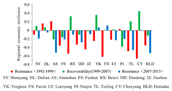 Based on the three-period division of the economic cycles of 14 cities in Liaoning Province explained in the previous section (Figure 2 and Figure 3), we measured the regional economic resilience in this section. Martin and Sunley stress that resilience is a process that involves several elements: regional vulnerability to shocks, regional resistance to shocks, regional adaptability to shocks, and the extent of regional recovery and development after shock [11]. The vulnerability and adaptability are closely related to the resistance and recoverability, respectively. Regions with high vulnerability are more vulnerable to shocks, and their ability to resist shocks is low. The areas that can maintain development and adjust to shocks will show high recoverability characteristics in the subsequent recovery and development stages. Therefore, in this paper, resistance and recoverability are chosen to reflect regional economic resilience [6,8]. The paper calculates the regional economic resistance or recoverability during the periods of contraction (1992–1999, 2007–2015) or expansion (1999–2007) to display the abilities of regional economic resilience [8]. The expected change of GDP in region i during a recession or recovery, i.e., the duration of k periods, would be given as