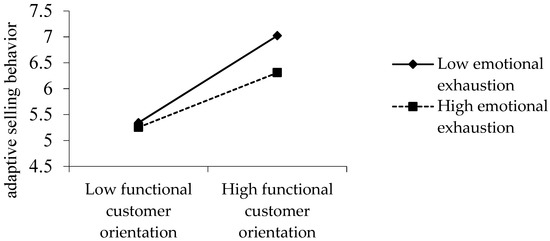 Figure 2 shows the moderating effect of emotional exhaustion on the relationship between functional customer orientation and adaptive selling behavior. We plus/minus one standard deviation from the mean emotional exhaustion score, in order to represent high/low emotional exhaustion. We used the same method to calculate the high/low functional customer orientation.