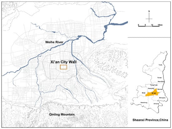 Located in the north-western region of China, Xi’an is near the centre of the Chinese territory. Straddling the banks of the Wei River in the central part of the Guanzhong Plain, the city has evolved over thousands of years. The urban layout of XCW before modernization was formed on the basis of the Sui-Tang imperial capital built in 582 B.C. After the Tang Dynasty (618–907 B.C.), the capital Chang’an was severely destroyed repeatedly. The then military governor, Han Jian, rebuilt the city on the foundation of the original imperial city. In 1370 B.C. (in Ming Dynasty), XCW was extended 1435 meters eastward, and further enlarged 864 meters northward three years later. According to archaeological surveys, the perimeter of XCW reached 13.73 kilometres after the completion of its urban expansion in 1378 B.C. [50]. Since then, the basic structure and scale of XCW were established. During 1781 and 1784 of the Qing Dynasty (A.D. 1636–1912), the then governor, Bi Yuan, comprehensively reinforced and repaired XCW and dredged the adjacent moat [51]. From that time, XCW took its initial shape to constitute a defence fortification with a moat, drawbridges, watchtowers, corner towers, parapet walls, gate towers, and inner loops, i.e., the present site of XCW (Figure 2).