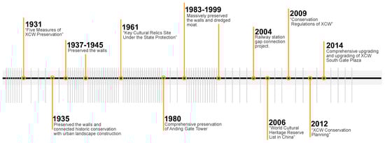 The timeline of the conservation progress of the Xi’an City Wall since modern times.