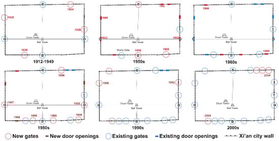 The widespread industrialization of Xi’an began after the Longhai Railway opened to Xi’an in 1934. The degree of development of transportation systems stipulates the spatial structure of a society. In each period, changes made to both the inner and outer passages (including gates and door openings) of XCW was the most important factor affecting the change of its form, as shown in the chart (Figure 4).