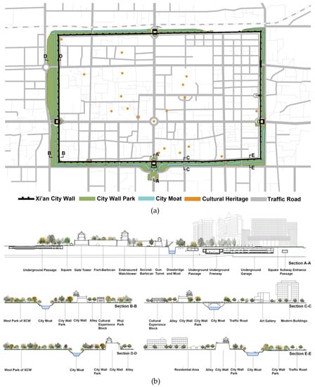(a) The plan diagram of the Xi’an City Wall; (b) the section diagram of the Xi’an City Wall.