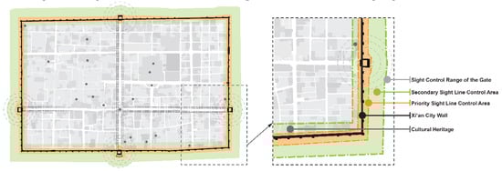 In addition, the landmark of XCW is a strategic point that can be entered by the observer in the city. It is the focus of people’s intercourse. As the dominant landscape feature, the huge city wall has a distinct image which attracts people and gives prominence to the city. In order to highlight the landscape, sight line control planning of XCW was carried out. According to the planning requirements, it was divided into two parts: the priority sight line control area and secondary sight line control area (Figure 6, Table 1). In the priority sight line control area, all occupancy and construction were prohibited. The original appearance of the ancient city wall was maintained. Except for garden buildings, no other buildings or underground works that affect the safety of the walls were to be constructed. The height of the buildings in the area would not be allowed to exceed 12 m. In the secondary sight line control area, the height of the buildings in the area would not be allowed to exceed 25 meters. In addition, the height, volume and shape of the building near the four gates and the main road entrance connecting with the city wall were restricted more strictly according to the angle of view. Thus, the landscape of XCW was better highlighted.
