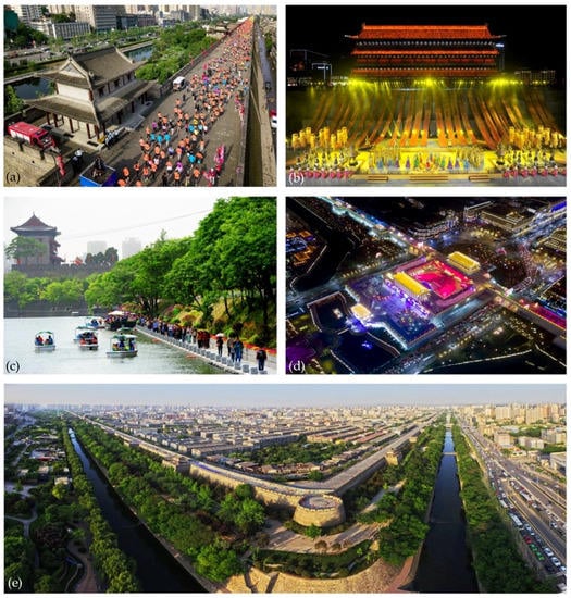 The city wall is an ancient military defence structure forming the boundary to enclose the urban area [1,2]. Along with great social changes and urban transformation, city walls have evolved through the process of urban modernization since the mid-19th century. Under the influence of political, military, economic and cultural factors, city walls have undergone several developmental phases such as reconstruction, transformation, demolition and conservation [3,4]. There were over 1400 city walls in ancient China [5]. However, China’s modernization overlooked their historical value, whereby most cities were eager to adopt a western style, ignoring the traditional culture. Therefore, in the early 20th century, China’s coastal cities gradually demolished their city walls [6]. Since the 1950s, most cities have demolished their city walls, leaving few [7]. Only 14 of the remaining ancient city walls in China are well preserved and have become important historical relics [8,9]. Among them, Xi’an City Wall (XCW) is the most completely retained city wall. Its great historical and cultural values enlist XCW as a candidate of World Cultural Heritage (UNESCO World Heritage Centre 2008).
