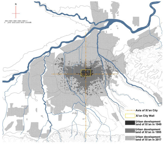 Xi’an city had begun its modernization development since the early 20th century, and the form of the urban space has undergone corresponding changes. However, the existence of XCW forms an important benchmark for the Xi’an city space structure, thus maintaining and supporting the traditional urban pattern to differentiate Xi’an from other historic cities. The conservation of XCW is the material basis for the grand pattern of modern Xi’an, according to the “Master Plan of Xi’an City (1952–1972).” On the basis of the data about the Urban Construction Bureau Archives, the spatial pattern of Xi’an City under the leading factors of XCW was drawn (Figure 8). It can be seen that in 1949, the scope of urban development land was also subject to the XCW. Since then, when modern construction began, the scope of urban development land up to 1995 shows that with the continuous growth of the economy through the urban construction in Xi’an has expanded to the periphery of the city. From 1995 to 2017, the urban built-up area of Xi’an has expanded even more rapidly. Since then, it has been a period of functional evacuation and cultural revival in the inner-city wall. Following the planning of the city wall as the core and the development of the axis, the overall urban space still maintains the unique urban style of Xi’an.