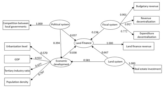The path coefficient of the land system and land finance was 0.667, with the t-test being significant. Thus, H3 is valid, that is the land system has a significant positive correlation with land finance. The existing ownership system guarantees the legality of land fiscal revenue. Urban land is in State possession, whereas township and county governments are entitled with the power to transfer the use of land. Thus, consideration, or revenue from land transfer, is realized by the local government when land users need access to land. Therefore, the essence of land transfer revenue is the reasonable and legal realization of land ownership by economic means [45]. China’s Constitution, land management law, and other related regulations stipulate clearly that “the State may, for the needs of the public interest, expropriate or requisition land in accordance with the law and provide compensation”. Land transfer is the governments’ extension of State-owned land under the dual urban-rural land system. It provides policy sanction to compensate for the inadequacy of limited urban stock and to maintain revenue from land for a certain period of time [23]. In addition, under China’s current land management system, the land’s supply end is monopolized by the government. The development of the market economy has led the urban land market to become increasingly mature, and land prices and land transactions have continued to develop, especially in the 1980s. After the emergence of the real estate market, land was used as the basis of real estate, and its transaction prices continued to be coordinated with the market. Therefore, the trend of the simultaneous rise in transaction prices with real estate growth occurred. Under the government’s monopoly of land supply and the circumstance that the demand side determines the market price, the revenue from land transfer continued to increase, thereby boosting land finance further.