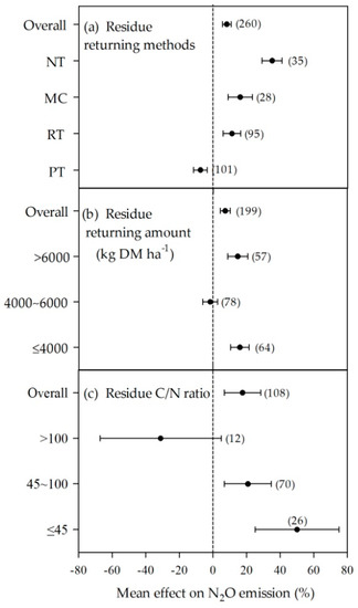 In order to determine mean effect size, METAWIN 2.1 software was performed and 95% bootstrapped confidence intervals (CIs) were generated [41]. Relative to control, the treatments were considered significantly positive or negative if the 95% CIs for cumulative seasonal N2O emission changes did not overlap with zero [42]. p values for differences between categories of studies were calculated in METAWIN 2.1 software. For simplicity, lnR analysis results were back-transformed and reported as percentage change under residue returning relative to the controls, and the calculation equation was (() × 100%) [4].