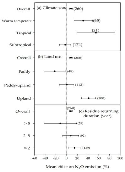 Regarding climate zone, residue returning significantly increased soil N2O emissions relative to no-residue returning in both warm temperate (mean: 31%) and tropical (mean: 54%) climate zones (Figure 3a). In contrast, the observed inhibitory effect was not significant in the subtropical (mean: −3%) climate zone (Figure 3a).