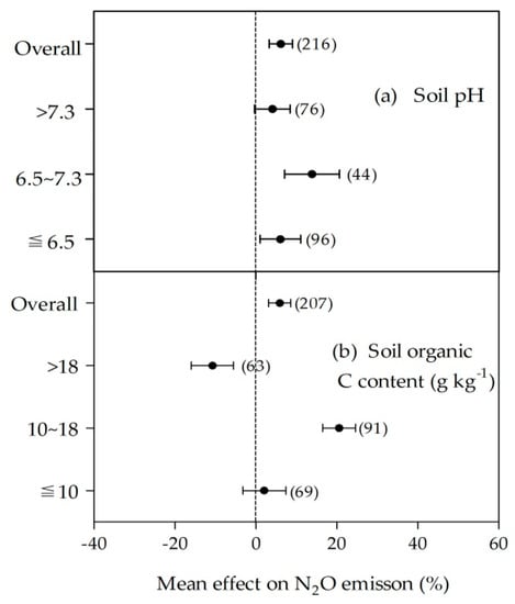 Effects of soil pH (a) and soil organic C content; (b) on N2O emission following residue returning (mean ± 95% CIs). The number of observations is shown in parentheses. The effect was considered significant if the 95% CI of the mean effect did not overlap with zero.