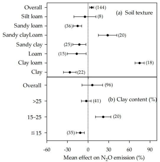 Effects of soil texture (a) and soil clay content; (b) on N2O emission following residue returning (mean ± 95% CIs). The number of observations is shown in parentheses. The effect was considered significant if the 95% CIs of the mean effect did not overlap with zero.