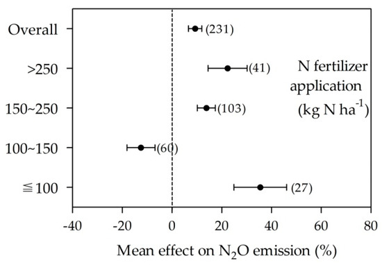 Effects of N fertilizer input (kg N ha−1) on N2O emission following residue returning (mean ± 95% CIs). The number of observations is shown in parentheses. The effect was considered significant if the 95% CIs of the mean effect did not overlap with zero.