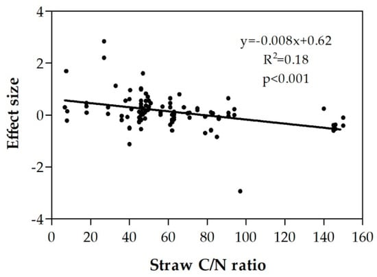 The negative correlation between residue C/N ratio and soil N2O emission has been previously reported [38,63]. In our meta-analysis, the effect size generally decreased with increasing crop residue C/N ratio (Figure 7), and these values were significant at ratios below 100. With low residue C/N ratio, crop residue returning could supply enough N to meet crop growth, and improve soil microbial communities, further promoting N2O production and emission [64]. In contrast, crop residue with high C/N ratio increased N consumption and caused more N immobilization during residue degradation, thus, leading to lower N2O yields. In addition, other characters of crop residue, including lignin, polyphenol, and dissolved C may also play important roles in soil N2O production and emission [65]. However, relevant studies are lacking, and more are needed regarding the effects of returning residue characters on N2O emissions.
