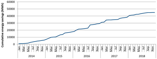 One of the plants that had a slow start up was the Hallsberg plant. It is a small plant in the group, employing approximately 500 people, but still regarded as one of the major users of energy. The plant has three major operations: weld, paint, and assembly, where the paint shop accounts for approximately 50% of the electricity used. The amount of total electricity used in the plant was 9760 MWh by 2013 and by the end of 2016 the total amount of electricity was reduced to 7871 MWh. The environmental coordinator position was vacant during the roll-out of the program in 2013 and the energy manager became a team leader for one of the workstations by the end of that year. This person was appointed for two hours a week by the local organization to fulfill the expected requirements from the global energy team. In order to fulfill the expected actions, the person became dependent on the contribution of persons from the daily operations. An energy group was formed with maintenance, engineering, estate, and operators, and later the new environmental coordinator became an important player for the long-term targets and local management communication. During the period 2014–2016, the number of people attending the meeting every second week was constantly seven to nine people. The reason for this high attendance is related to the meeting as being open-minded; every proposal for efficiency improvements was considered and if manageable, taken into action. The focus was set to work on the idle electricity. After six months, the structure of reporting data and finding actions concerning what, who, and when had been established. The attention from the global energy team was often mentioned at the meetings; the direct information and the requests for results pushed the group forward. By November 2014, a list of improvements and a list of investments had been developed, including a measurement system on the unit level. By 2016, with the number of 230 closed action items on the list, the plant had already reached the level of improvement required by the targets set for 2020. The items worked on had been all from behavioral change of the staff to becoming more aware of the energy and acting upon a daily basis, to reduce temperatures, detect leakages and by changing equipment both in the processes and in the facilities. The targets were therefore stretched by the global energy team in 2016 and introductory meetings about how to reach ISO 50001 certification were held. During this time, top management and engagement have varied; four different plant managers have been in the position since the start of 2013, and major redundancies for the staff were announced in 2016. Nevertheless, the approach has sustained and has delivered the expected results. The total final saving at the end of 2016 was more than 30% of idle energy electricity compared with 2013, resulting in a saving of 2.5 GWh for the single plant and the long-term targets from WWF were already met. For the whole corporation, the savings resulted in reduced idle energy use to up to 30 GWh in 2016 compared with 2013, showing the hidden cost and the potential of expanding the activities of energy saving in the company. Figure 2 shows the total cumulative energy savings between 2014 and 2018.